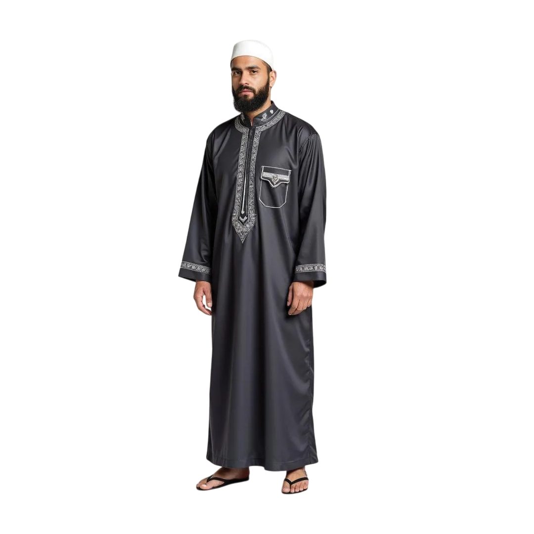 A timeless expression of culture and refinement, this embroidered thobe is designed for the modern man who values tradition. Crafted with intricate detailing, it is perfect for special occasions, religious gatherings, and elegant daily wear.