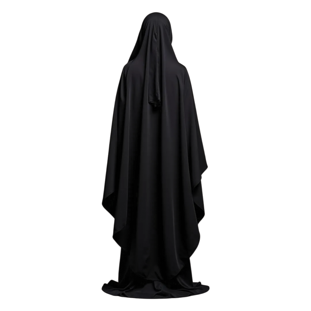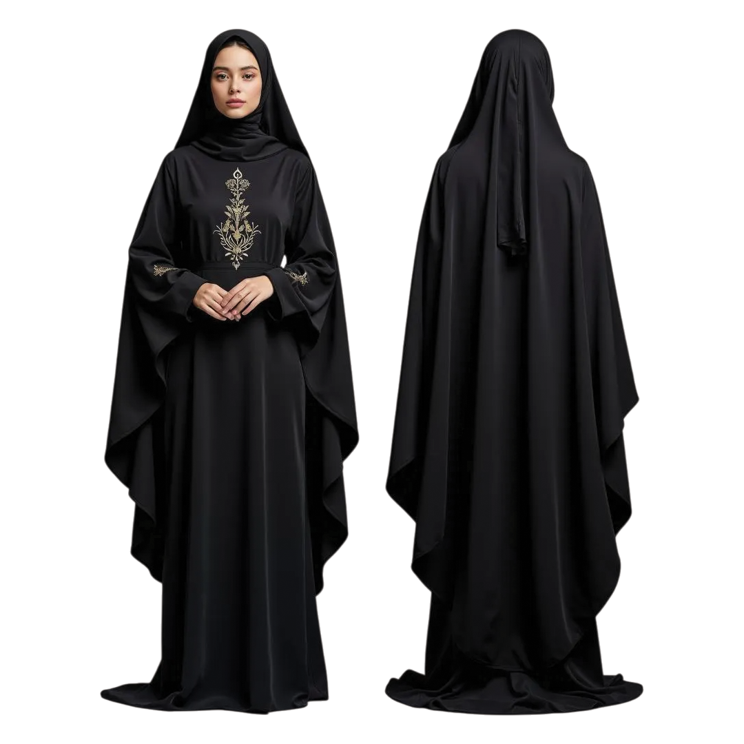 A stunning blend of regal grace and modest charm, this abaya is designed for women who appreciate timeless sophistication. The handcrafted golden embroidery over luxurious black crepe makes it a true statement piece for formal and special occasions.
