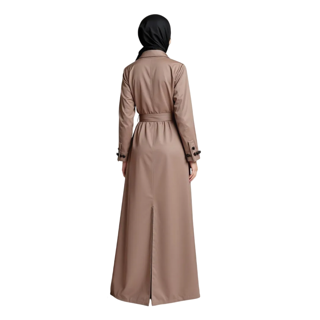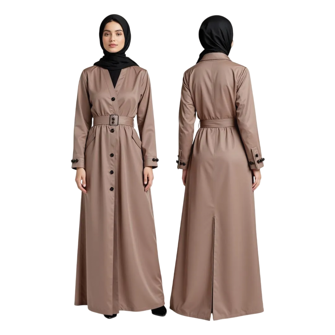 Embrace timeless sophistication with this structured yet graceful abaya. The warm, earthy taupe hue complements the modern silhouette, while the tailored belt and button-down design exude refined elegance. Perfect for effortless day-to-evening transitions, this piece is a must-have for the contemporary woman.