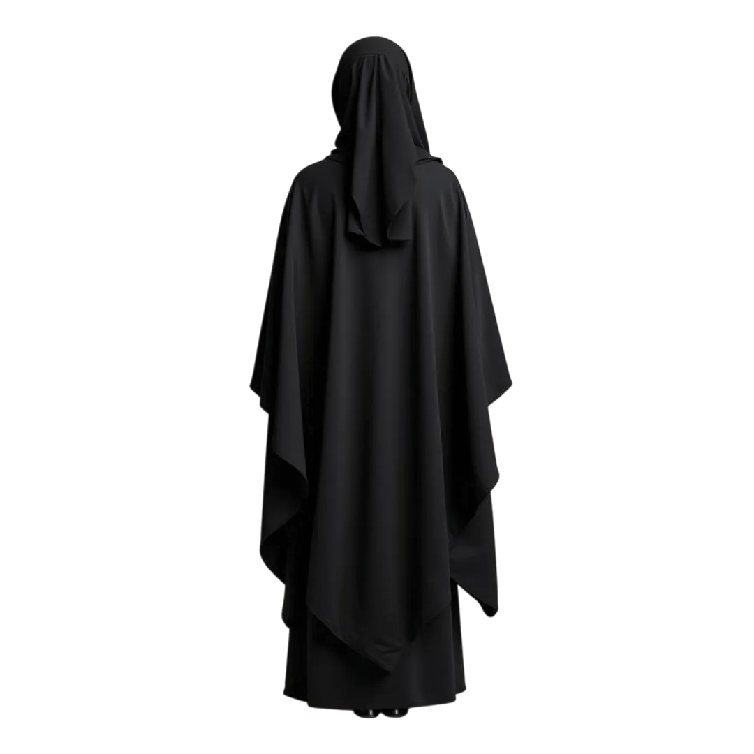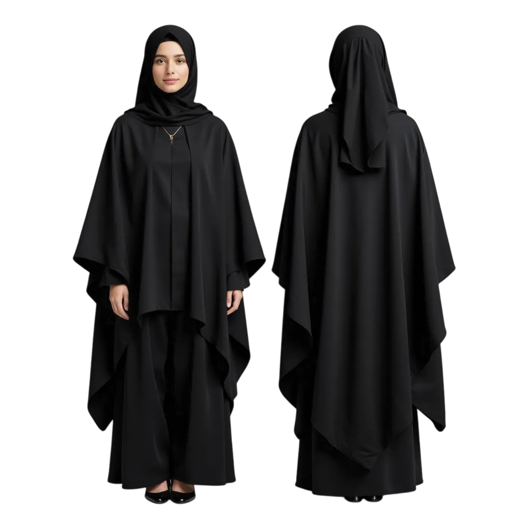 Introducing the Zarqa Draped Set — where quiet elegance meets Islamic sophistication. This full-length black abaya is designed with fluid, wing-like layers that offer both structure and softness, making it perfect for everyday wear or special gatherings.